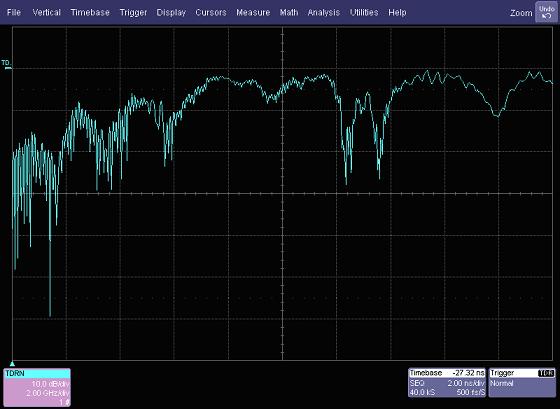 回波損耗或S11 是頻域的測量和反射系數(shù)有關(guān)。歸一化(通過反射平面校準(zhǔn) 基線校正)反射系數(shù)的傅里葉變換給出了回波損耗是頻率的函數(shù)。圖2給出了USB 3.0線纜和連接器測量的結(jié)果。圖中的橫軸表示2GHz/div,范圍是0~20GHz,縱軸表示10dB/div?;夭〒p耗在2GHz大約是15dB,但隨著頻率的增加開始變得越來越小。精細(xì)的空值間隔是由線纜末端的連接器引起的,較大的空值間隔是由于連接器內(nèi)部的阻抗結(jié)構(gòu)決定的。