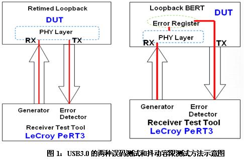 對于USB3.0的接收機測試還可以使用另一種方法:即Loopback BERT Method。如下圖1的右圖所示:DUT的接收端工作在Loopback BERT模式,直接分析BERT發(fā)送出的已知的測試碼流,對接收到的誤碼計數(shù),誤碼數(shù)量存入誤碼寄存器(如下圖1的Error Register),LeCroy PeRT3直接讀取誤碼寄存器,得到誤碼率和抖動容限測試結果。