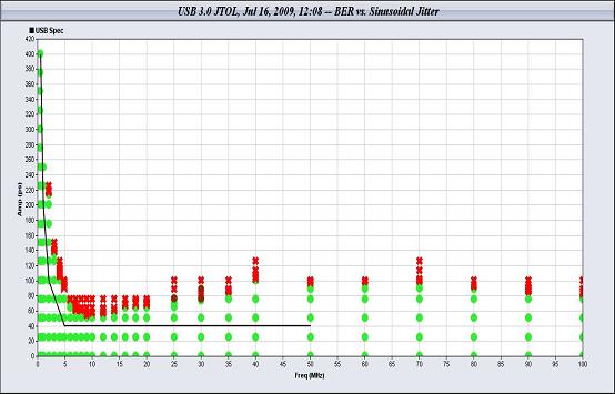 力科PeRT3可以自動測量多個頻點下的抖動容限和誤碼率,如下圖5所示為某USB3.0芯片的抖動容限測試結果,橫軸為頻率,縱軸為該頻點的抖動幅度,黑線為USB3.0規(guī)范要求的抖動容限,紅點為出現(xiàn)誤碼的正弦抖動的幅度,由于紅點都在黑線之上,說明該芯片接收端的抖動容限滿足規(guī)范要求。