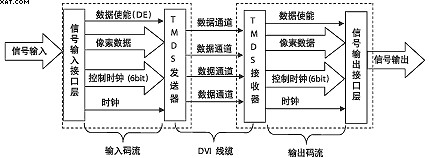 DVI是基于TMDS(TransitionMinimizedDifferentialSignaling,轉(zhuǎn)換最小差分信號(hào))技術(shù)來(lái)傳輸數(shù)字信號(hào),TMDS運(yùn)用先進(jìn)的編碼算法把8bit數(shù)據(jù)(R、G、B中的每路基色信號(hào))通過(guò)最小轉(zhuǎn)換編碼為10bit數(shù)據(jù)(包含行場(chǎng)同步信息、時(shí)鐘信息、數(shù)據(jù)DE、糾錯(cuò)等),經(jīng)過(guò)DC平衡后,采用差分信號(hào)傳輸數(shù)據(jù),它和LVDS、TTL相比有較好的電磁兼容性能,可以用低成本的專用電纜實(shí)現(xiàn)長(zhǎng)距離、高質(zhì)量的數(shù)字信號(hào)傳輸。TMDS技術(shù)的連接傳輸結(jié)構(gòu)如圖1所示。