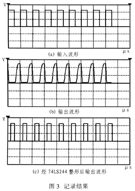 調(diào)試中,輸入周期為100μs,占空比為1/2的+5V方波,對(duì)一路光耦的輸入端波形和經(jīng)過(guò)20m長(zhǎng)線后接收光耦的輸出端波形以及經(jīng)過(guò)74LS244整形后的波形進(jìn)行記錄。記錄結(jié)果如圖3所示。
