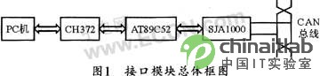 本文所介紹的USB-CAN轉(zhuǎn)接技術(shù)總體框圖如圖1所示,該設(shè)計(jì)分兩大部分:一是與主機(jī)USB接口相連的USB控制部分;二是與CAN總線相連的CAN控制器部分。兩者中間通過單片機(jī)聯(lián)系起來。USB控制部分用USB接口控制芯片CH372來實(shí)現(xiàn)數(shù)據(jù)的接收和發(fā)送;CAN控制器SJA1000用來實(shí)現(xiàn)CAN總線間的數(shù)據(jù)通信。單片機(jī)用來進(jìn)行相應(yīng)的控制、協(xié)調(diào)以及系統(tǒng)的通信。