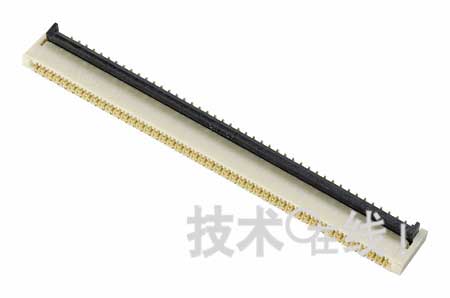 此制品以間距0.3mm、高1.1mm、進深4.3mm(滑片鎖上時)尺寸,制成了90引腳的多極連接器。合適的FPC厚度為0.2mm。因采用上下配備接點的構(gòu)造,設(shè)計時可無需考慮插入的FPC接點方向。