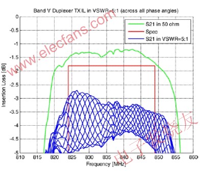 圖3:當(dāng)手機(jī)的窄帶雙工或接收濾波器沒有端接到其特征阻抗時(shí),在通帶中也會(huì)出現(xiàn)紋波。本例中,VSWR為5:1的阻抗失配使插入損耗大幅度增加。