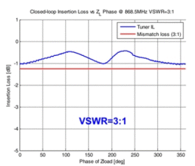 失配傳感器把VSWR(反射回天線的功率幅度)與發(fā)射功率進(jìn)行比較并調(diào)節(jié)阻抗調(diào)諧電路。調(diào)諧算法使可調(diào)元件在各種使用情況下持續(xù)跟蹤環(huán)境條件,并把阻抗調(diào)到最優(yōu)值(見圖1)。