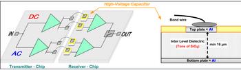 圖2的右側(cè)顯示了一個(gè)高壓電容器的橫截面。從發(fā)送器芯片出來(lái)的接合線連接到接收機(jī)端電容器鋁頂板。底板(也為鋁質(zhì))連接到接收機(jī)邏輯。板之間是夾層電介質(zhì),其為16-μm厚的二氧化硅(SiO2)層。