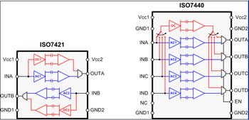 電容隔離的另外一個(gè)優(yōu)點(diǎn)是每個(gè)電容123毫微微法拉(123x10-15F)的超低容量,從而允許極高的數(shù)據(jù)速率傳輸并實(shí)現(xiàn)多通道隔離器的微電容幾何尺寸。