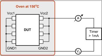 實(shí)際上,周圍溫度維持在150oC時(shí),TDDB由隔離器的施加應(yīng)力電壓決定(請(qǐng)參見圖5)。測(cè)試之初便激活一個(gè)計(jì)時(shí)器,其在隔離器電流超出1mA時(shí)停止,表明電介質(zhì)擊穿。記錄每個(gè)測(cè)試電壓的故障時(shí)間,并根據(jù)理論E模型曲線進(jìn)行繪圖。