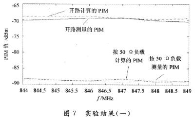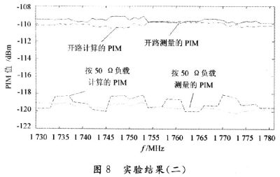 由以上的分析可知,這種計(jì)算方法計(jì)算出來(lái)的PIM值和真實(shí)的PIM值十分接近,并且隨頻率的變化趨勢(shì)一致。同時(shí)可以看出,在開路的時(shí)候所測(cè)量的 PIM明顯要比接負(fù)載的時(shí)候所測(cè)量的PIM要大,增大的PIM值是因?yàn)槠ヅ洳缓盟斐?,?dāng)然,相同的負(fù)載狀況在不同的頻率下呈現(xiàn)的匹配狀態(tài)是不一樣的。