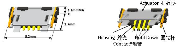 該連接器為0.2毫米(錯位排列)連接間距,帶有0.4毫米導(dǎo)向位。目前可提供11針和29針,計劃最多達(dá)81針。連接器高度為0.9+/-毫米。其外殼材料為熱塑塑料(UL 94V-0), 固定調(diào)整片和連接器的銅合金無鹵素。作為底部接觸型產(chǎn)品,因此可最為廣泛地適用于掀蓋式執(zhí)行器,很方便進(jìn)行關(guān)門操作。就連接器規(guī)格而言,連接器可通過帶有外殼開槽結(jié)構(gòu)的耳式電纜分割結(jié)構(gòu)提供電纜預(yù)持功能。要求的電纜厚度是:0.2毫米+/-0.03