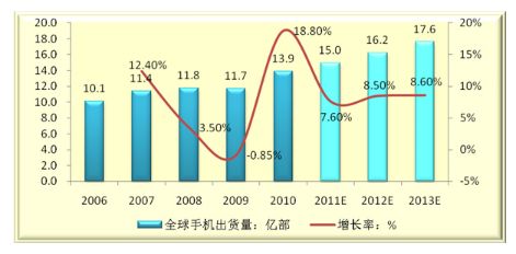 - 預(yù)計2010-2013年全球手機出貨量將保持7%以上的增速