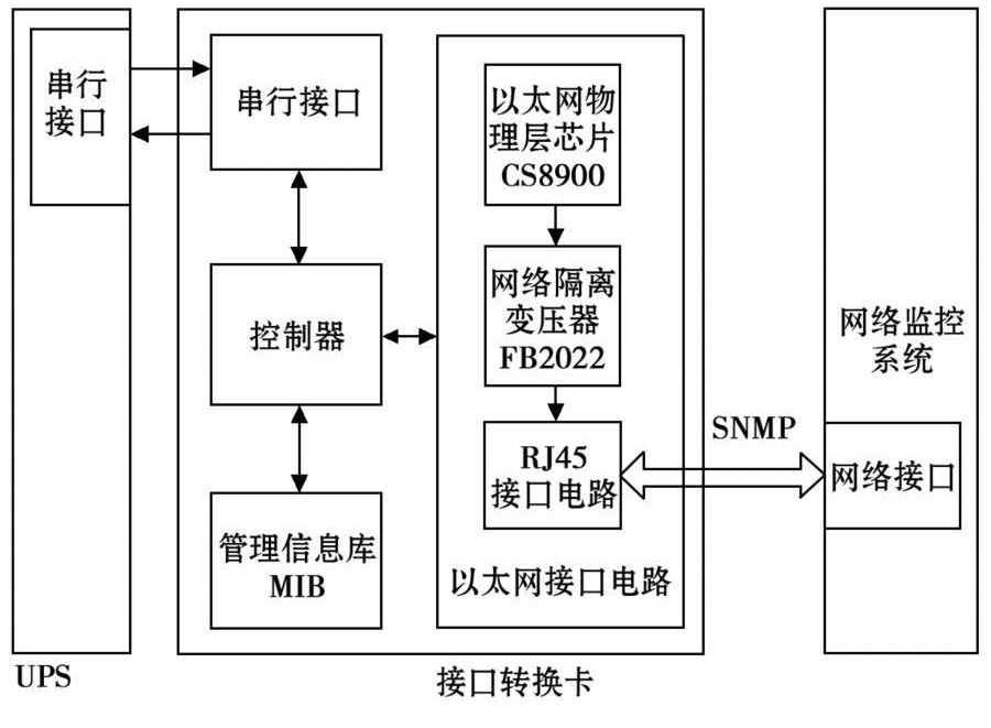 用戶可根據(jù)自己的需求,定義包含UPS監(jiān)控信息參數(shù)的管理信息庫,并將其保存。接口轉(zhuǎn)換卡的串行接口電路與UPS上的串行接口相接,控制器通過控制串行接口電路來獲取UPS的工作信息。處理器將接收到的數(shù)據(jù)與管理信息庫中所定義的數(shù)據(jù)一一對應(yīng)并保存,并通過以太網(wǎng)接口電路定時向網(wǎng)絡(luò)管理系統(tǒng)發(fā)送用戶需要的即時信息。網(wǎng)絡(luò)管理系統(tǒng)對管理信息庫中的變量進行操作,向接口轉(zhuǎn)換卡發(fā)送查詢和設(shè)置節(jié)點等命令,處理器通過查詢MIB中相應(yīng)的節(jié)點信息,根據(jù)串口通信協(xié)議向UPS發(fā)出相應(yīng)的命令,再將得到的結(jié)果返回給網(wǎng)絡(luò)監(jiān)控系統(tǒng)。