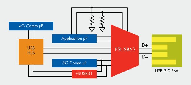 4G手機(jī)的最新趨勢是在手機(jī)中集成兩個處理元件,同時訪問USB端口。對于這種應(yīng)用,一個比較好的選擇是采用集線器。不過麻煩在于USB集線器的接線通常是電容性的,功耗相當(dāng)大;而另一方面,同時訪問USB端口的機(jī)會又不多。圖2所示為這種手機(jī)的一種設(shè)計方法,其中,3G通信處理器必需與4G處理器分開來單獨訪問USB端口。通過一個隔離開關(guān)(FSUSB31),并采用極短的PCB引線,可以盡量減小電容。這樣一來,在從3G通信處理器到USB主設(shè)備的路徑上,一個高速發(fā)射USB數(shù)據(jù)眼(data eye)與USB規(guī)范相比有很大的裕量。在這個例子中,應(yīng)用處理器控制USB 3:1多路復(fù)用開關(guān),當(dāng)后者在待機(jī)模式下處于低電狀態(tài)時,它可以讓自己的控制線路上的上拉和下拉電阻連接到默認(rèn)的應(yīng)用處理器。