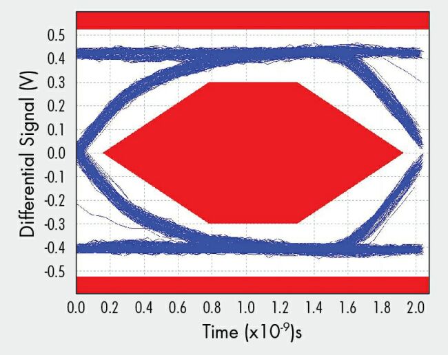 對于大多數(shù)集成電路而言,高速和低功耗一般是一對相互矛盾的特性。能夠兩者兼具的解決方案常常需要降低電壓,并使用精細(xì)的幾何工藝尺寸;然而,USB規(guī)范要求的是高電壓信號。在性能穩(wěn)健的手機(jī)設(shè)計中,D+和D-信號能夠承受至5V VBUS信號線的短路,故限制了低電壓解決方案。不過,最近推出的低功耗電荷泵USB開關(guān)解決了這個問題,并滿足嚴(yán)苛的USB發(fā)射眼圖要求,如圖3所示。事實上,無需對架構(gòu)或所選器件做任何修改,大多數(shù)這類設(shè)計的工作速率就能夠達(dá)到高速USB數(shù)據(jù)速率(> 1 Gbps)的兩倍以上。