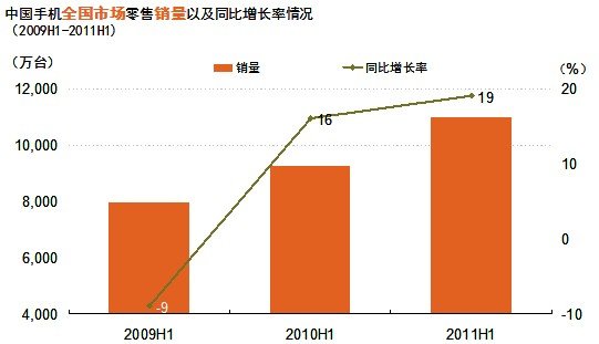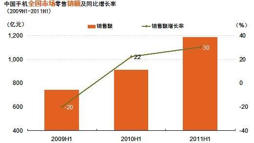 2011年上半年手機(jī)市場繼續(xù)保持較快增長。據(jù)GfK(捷孚凱中國)全國零售監(jiān)測數(shù)據(jù)顯示,2011年上半年銷售量已達(dá)到1.1億臺(tái),同比增長19%,銷售額達(dá)到1186億元,銷售額同比增長30%。