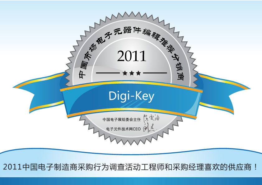 在近日剛剛結束的2011中國電子制造商采購行為調(diào)查暨中國市場電子元器件領軍廠商的評選活動中,Digi-key憑借廣泛的電子元器件庫存、最全面的在線資源和快速響應客戶訂單等多方面優(yōu)勢,以及在工程師心目中形成的良好形象,一舉榮獲2011中國市場電子元器件編輯推薦分銷商稱號!