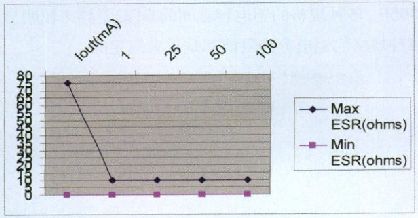 舉例來說,如果使用10μF的鉭電容用于負載線瞬態(tài)穩(wěn)定,10kHz下測得的ESR的安全工作范圍為最大10Ω,最低10mΩ(見圖2)。
