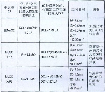 MLCC的額定電壓可以與工作電壓相同或者略高,因此6V的額定電壓已經(jīng)足夠。對 MLCC 而言,如果已知 IR (見表5)和工作電壓 (4V),可以計算出 DCL.適用于低DCL應用的MLCC有X5R和X7R兩種電介質。根據(jù)額定工作電壓,可以根據(jù)歐姆定律,用元件的IR值計算出 DCL.
