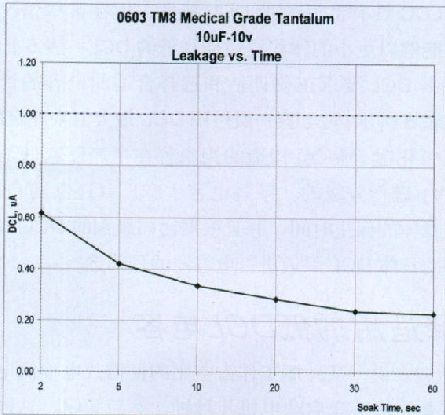 圖8是一種47uF-10V的鉭電容,雖然其最大DCL為4.7uA,根據(jù)特定的保壓時間篩選后,可為應用提供超低DCL.以圖8的元件為例,該批量可以按照10秒鐘DCL 600nA的標準篩選,從而把總體 DCL 從 4.7uA 降至 600nA 限值。