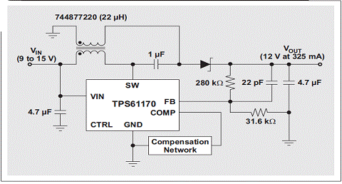 盡管DC/DC單端初級(jí)電感轉(zhuǎn)換器 (SEPIC) 拓?fù)洳皇鞘裁葱聳|西,但的確直到最近它才開始流行起來(lái),然而,對(duì)于能夠?qū)Ω叩洼斎腚妷褐g的輸出電壓(例如:12V未校準(zhǔn)插墻式電源)進(jìn)行調(diào)節(jié)的轉(zhuǎn)換器需求一直都存在。雖然我們可以將任何升壓轉(zhuǎn)換器/控制器配置為一個(gè) SEPIC,但其在最近才得到普遍的使用。兩個(gè)因素促進(jìn)了 SEPIC 的人氣大增:(1) IC 制造廠商已經(jīng)開始制造更多具有電流模式控制功能的升壓控制器,旨在簡(jiǎn)化補(bǔ)償;(2) 電感制造廠商已經(jīng)開始制造許多可以最小化轉(zhuǎn)換器總 PCB 體積的單封裝耦合電感。改用耦合電感以后,許多具有兩個(gè)單獨(dú)電感應(yīng)用的電源體積可以縮減三分之一。圖 1 顯示了使用 TI TPS61170 和 Wuerth 744877220 的一個(gè) SEPIC。