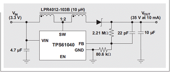 集成 FET 的 DC/DC 轉(zhuǎn)換器的輸出電壓受限于轉(zhuǎn)換器的開關(guān)電流額定值。將一個(gè) 1:1 以上匝比的耦合電感連接至轉(zhuǎn)換器的開關(guān) (SW) 引腳,可以擴(kuò)展所有升壓轉(zhuǎn)換器的有效輸出電壓范圍。例如,圖 4 顯示了 30-V 絕對(duì)最大電流額定值的 TI TPS61040 升壓轉(zhuǎn)換器,其作用是提供 35V 或更高的電壓,同時(shí)還顯示了一個(gè) 1:2 耦合電感 Coilcraft LPR4012-103B。耦合電感結(jié)構(gòu)多繞組端與二極管串聯(lián)時(shí),單繞線電感——以及由此產(chǎn)生的轉(zhuǎn)換器開關(guān) FET—電壓只有輸出電壓的三分之一,即負(fù)輸入電壓。