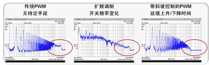 要滿足智能手機(jī)揚(yáng)聲器放大器的這些期望性能要求,D類放大器是極佳選擇。如D類放大器提供極低EMI,避免與其它RF電路產(chǎn)生干擾。實(shí)際上,D類放大器將輸入的模擬音頻信號轉(zhuǎn)換為脈寬調(diào)制(PWM)的脈沖信號,再以此脈沖信號控制開關(guān)器件來導(dǎo)通/關(guān)閉音頻功率放大器。對于智能手機(jī)應(yīng)用而言,要降低音頻輸出段的EMI,重要的是減少較高頻率的頻譜部分。傳統(tǒng)PWM技術(shù)沒有特定手段來應(yīng)對。但要做到這一點(diǎn),可以采用兩種技術(shù),一是PWM擴(kuò)頻調(diào)制(開關(guān)頻率變化),一是帶斜坡控制的PWM(延緩上升/下降時(shí)間)。相比較而言,斜坡控制技術(shù)比擴(kuò)頻調(diào)制技術(shù)在減少較高頻率的頻譜方面更為有效,更有利于降低EMI。