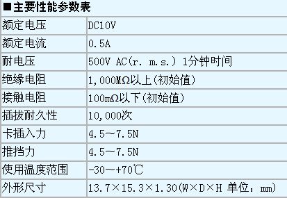 “CIM-J38N”連接器采用了小型、薄型設(shè)計,標(biāo)準(zhǔn)安裝型的物理尺寸為高1.30mm、寬13.7mm、進(jìn)深15.3mm。連接器采用Push-in Push-out推擋方式,卡排出尺寸為3.8mm。同時還附帶防卡彈出止動結(jié)構(gòu)、裝載卡檢測開關(guān)(Normally open型)、RFID接頭,并增強了卡反向插入功能。另外還增強了EMI對策用接地線(Ground)功能。