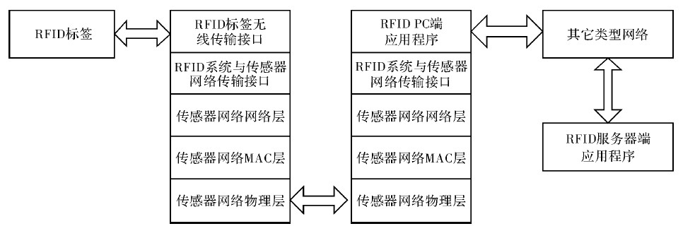 圖3 給出了WSN 與RFID 的融合方案協(xié)議層結(jié)構(gòu)示意圖,顯示了兩者融合的可行性和價(jià)值所在,無線傳感器網(wǎng)絡(luò)與RFID 系統(tǒng)相結(jié)合,將RFID 的識(shí)別信息通過WSN 網(wǎng)絡(luò),傳輸?shù)絉FID 服務(wù)器或其他網(wǎng)絡(luò)。