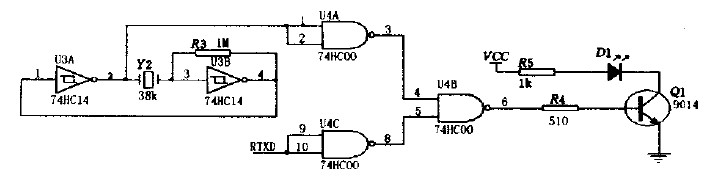 紅外發(fā)送器電路如圖3所示包括38kHz晶體振蕩器、反相器、與非門、驅(qū)動(dòng)門Q1和紅外發(fā)射管D1等部分。其中38kHz晶體振蕩器、電阻R3和反相器組成脈沖振蕩器,用以產(chǎn)生38kHz的脈沖序列作為載波信號(hào),紅外發(fā)射管D1選用Vishay公司生產(chǎn)的TSAL6238,用來向外發(fā)射950nm 的紅外光束。