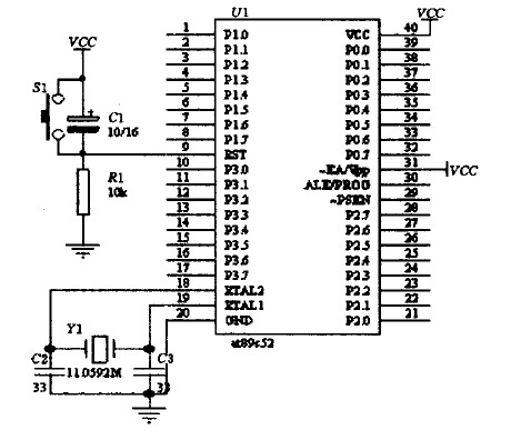 本單片機(jī)通過RS232串行通信接口與GSM 模塊通信,提取GSM 設(shè)備的短信,發(fā)送相關(guān)的信息,并通過串行通信接口與紅外模塊相連,利用紅外模塊,達(dá)到主、分機(jī)之間的通信,因此,選用AT89S52芯片??刂粕闲枰玫絻蓚€(gè)串行接口,但89S52只有一個(gè)串口,故還需要在程序中進(jìn)行模擬串行接口通信。其最簡外部接線電路如圖2所示。