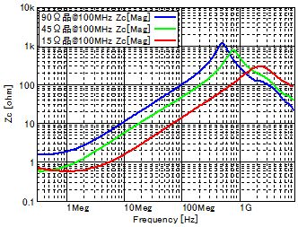 圖5顯示的MHL信號線使用各種共模扼流線圈時的輻射噪聲/信號波形評測結(jié)果。共模扼流線圈在產(chǎn)生噪聲的30MHz~1GHz頻率段內(nèi),按照阻抗由高到低的順序,分別使用以下3種類型(90Ω、45Ω、15Ω@100MHz) (靜態(tài)特性請參考圖6) 來進(jìn)行測量。