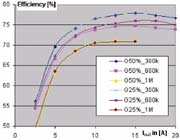 圖6所示效率是指不同頻率下負載電流和漏極電感的函數(shù)。此外,可觀察到如下結果: