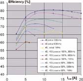 - 在600kHz,12.5A條件下, 漏極電感的50%比0%的效率將減少8.5%。由于MOSFET溫度過高,12.5A以上便無法進行試驗。