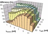 該結果的解釋需要進一步研究。現(xiàn)在我們可以說明,在電路板合理的電感值范圍內(nèi),漏極和源極電感必須減小,以確保高的轉換器效率。該仿真得出如下結果: