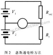 圖2中,V1,V 2是程控恒電壓源;Rstd是標(biāo)準(zhǔn)電阻; Rt是被測(cè)電阻;I是電流表。當(dāng)電橋平衡即流過(guò)電流表I的電流為零時(shí),有V1 /V2=Rstd/R t,由此可計(jì)算出Rt=R std×V2/V1 。