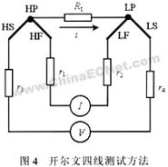 當(dāng)被測(cè)電阻阻值小于幾歐,測(cè)試引線的電阻和探針與測(cè)試點(diǎn)的接觸電阻與被測(cè)電阻相比已不能忽略不計(jì)時(shí),若仍采用兩線測(cè)試方法必將導(dǎo)致測(cè)試誤差增大。此時(shí)可采用開爾文連接方式(或稱四線測(cè)試方式)來(lái)進(jìn)行測(cè)試,如圖4。