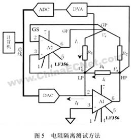 A2構(gòu)成電壓跟隨電路使Vc =Vb,從而I1=0。因此計(jì)算機(jī)通過(guò)16位電流輸出型DAC設(shè)定If 就控制了流過(guò)被測(cè)電阻Rt的電流I t,再通過(guò)由DVA和ADC構(gòu)成的電壓檢測(cè)電路測(cè)試出 Rt兩端的電壓就可算出Rt 的阻值。
