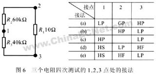 在這種情況下可以采用一種變形的開爾文連接方式來(lái)進(jìn)行測(cè)試,不再使用隔離方法。它仍采用四根線,但根據(jù)需要將其中一對(duì)或兩對(duì)F,S線分開接在不同的點(diǎn)上來(lái)進(jìn)行測(cè)試。這種方式稱為分離開爾文連接方式。本例中三個(gè)電阻要進(jìn)行四次測(cè)試才能計(jì)算出它們的阻值,四次測(cè)試的接法分別見圖6中的表,圖中1,2,3點(diǎn)為連接點(diǎn)。圖6-(b) 接法可直接測(cè)出R1的值;圖6-(c)可測(cè)出 R2與R3的并聯(lián)值R p;圖6-(d)和圖6-(e)分別測(cè)出阻值R2 ′和R3′。分析可知: