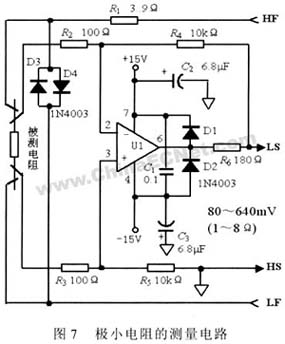對(duì)于極小阻值范圍的電阻測(cè)量可以采用圖7所示電路完成,它可以測(cè)量10~ 80mΩ的電阻。通過(guò)差分運(yùn)算放大電路,把被測(cè)電阻產(chǎn)生的微弱電壓信號(hào)放大100倍,因此實(shí)際電阻值是測(cè)量值要除以100。圖中運(yùn)放UI采用低噪聲、高速、精密運(yùn)放,如OP-37EJ,AD645或MAX400。和高電位施加線(HF)串聯(lián)的電阻R1是用來(lái)匹配電流施加模塊的最佳輸出負(fù)載,R2到R5采用高精度高穩(wěn)定性的電阻來(lái)保證差放電路增益的穩(wěn)定,這決定了測(cè)量的精度和重復(fù)性。為了保證精度,對(duì)運(yùn)放的電源電壓要求很高,電路的安裝位置要盡可能靠近被測(cè)電阻,所有探頭要盡可能短,C2,C3要盡可能靠近運(yùn)放。