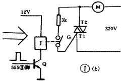 正確的方式見圖1b。可控硅與抽水電機組成抽水控制開關(guān),SCR的觸發(fā)由T2與G間接入電阻控制。當水位降低時,控制觸點開路,555第3腳輸出高電平(此電路部分省略),使Q導通,繼電器J吸合,SCR觸發(fā)導通,電機開始運轉(zhuǎn)。當水位達到時, 觸點經(jīng)水接通,555第3腳輸出低電平,Q截止,SCR在交流電過零時截止,抽水停止。
