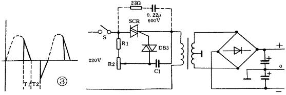 圖3是某電子雜志刊出的無級直流輸出調(diào)壓電路。原作者稱,利用Rc移相網(wǎng)路控制SCR的導通角改變變壓器初級的電流,從而獲得兩路連續(xù)可調(diào)的2x(0—17V) 的直流輸出電壓,負載電流為800mA 。很明顯,推薦電路(圖3)是普通移相式調(diào)功電路和降壓變壓器整流濾波電路的串聯(lián), 從基本原理分析,似乎無大的原則問題。變壓器初級每半周電流有效值隨可控硅導通角變化,次級輸出電壓的峰值、平均電流值都隨之而變。當然,一定負載時輸出整流電壓也必然改變。本人看后,極感興趣,依此原理制作了一臺輸出100±40V范圍變化的維修代用直流電源,并依照圖中虛線加入RC吸收回路。實驗時,該電路一接入電源,距此10米遠的電視機屏幕上即出現(xiàn)兩條緩慢移動的黑帶(從鄰居的責問中得知),同時,空載下不到十分鐘,SCR即擊穿。更不能容忍的是,降壓變壓器鐵心發(fā)出拖拉機啟動時的聲音,室內(nèi)電度表也發(fā)出同樣的聲音,而且,隨著輸出電壓的調(diào)低,聲音更大。