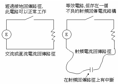Maxwell方程式、Kirchhoff和Ampere定律全部都在說:若要使一個(gè)電路正常工作或依期望的目的工作,一個(gè)封閉回路型網(wǎng)絡(luò)必須要存在。附圖五表示了這樣的典型電路。當(dāng)一條走線從來源端到達(dá)負(fù)載,一個(gè)回傳電流路徑也必須要存在,這是Kirchhoff和Ampere定律所規(guī)定的。