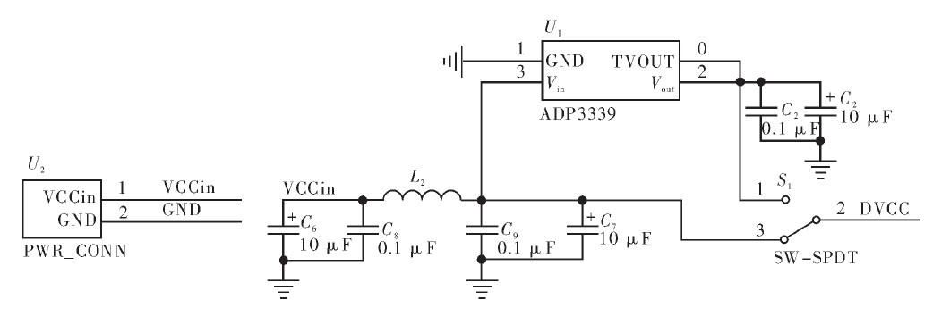 傳感器節(jié)點(diǎn)體積微小,通常攜帶能量有限的電池。能量供應(yīng)模塊在無線傳感器節(jié)點(diǎn)中至關(guān)重要,為傳感器節(jié)點(diǎn)各部分提供能量。需要長(zhǎng)時(shí)間數(shù)據(jù)采集的傳感器有的需要太陽能等方式來維持節(jié)點(diǎn)的正常運(yùn)轉(zhuǎn)。節(jié)點(diǎn)的各部分也需要精心設(shè)計(jì)。節(jié)點(diǎn)微處理器的工作電壓為1.8~3.6 V,無線射頻芯片工作電壓為2.1~3.6 V,Flash供電電壓為2.7~3.6 V,USB轉(zhuǎn)換芯片由USB供電。因此電源可以選用3 V紐扣電池供電,有效減少了節(jié)點(diǎn)的大小。另外USB也可以作為供電源,同時(shí)作為編程電源,電源單元如圖2所示。LC濾波單元對(duì)交流電具有較好的濾波效果,同時(shí)又不會(huì)降低直流輸出電壓。低壓差的穩(wěn)壓器ADP3339保證了電源較好的穩(wěn)壓性。