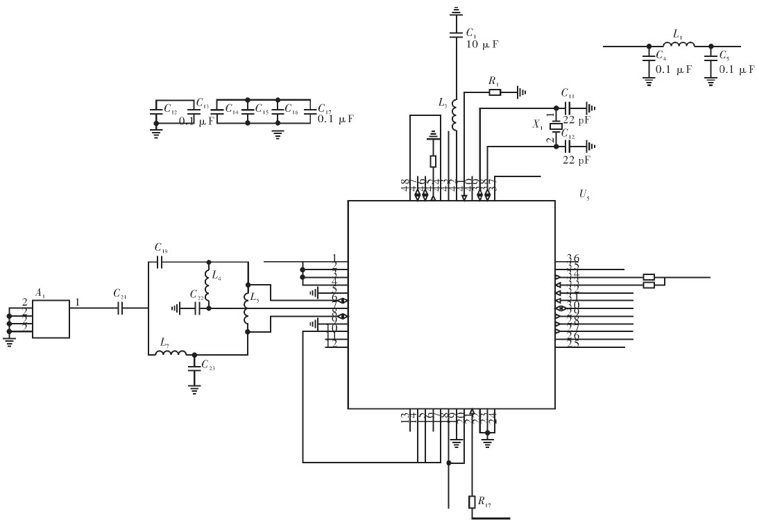 圖3中無線射頻模塊的外圍電路采用CC2420手冊(cè)提供的典型應(yīng)用電路的器件數(shù)值,這樣保證了芯片能工作在正常狀態(tài)。另外為達(dá)到最優(yōu)性能,必須使用電源去耦,去耦電容和電源過濾的設(shè)置和大小對(duì)于在應(yīng)用中獲得最優(yōu)性能起著關(guān)鍵作用,TI提供一個(gè)緊湊的參考設(shè)計(jì),必須嚴(yán)格按照該設(shè)計(jì)進(jìn)行。同時(shí)增加數(shù)字、模擬電源采用電容濾波。CC2420需要一個(gè)16 MHz的參考時(shí)鐘用于傳輸速率為250 kbit·s-1的數(shù)據(jù)收發(fā),參考時(shí)鐘可以來自外部時(shí)鐘源,也可以由內(nèi)部晶體振蕩器產(chǎn)生,這里采用內(nèi)部晶體振蕩器產(chǎn)生的方式。天線阻抗匹配至關(guān)重要,為獲得較好的發(fā)射功率,在原有基礎(chǔ)上對(duì)部分電容、電感進(jìn)行了適當(dāng)?shù)恼{(diào)整。CC2420與微控制器的通信通過4線SPI總線實(shí)現(xiàn)(SI、SO、SCLK、CSn),通過控制FIFO和FIFOP管腳接口狀態(tài)可以使芯片工作在發(fā)射或接收模式,另外CCA用于空閑信道評(píng)估,SFD用于控制時(shí)鐘或定時(shí)信息的輸入。