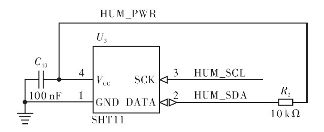 SHT11電源供電要求為2.4~5.5V,電源和時(shí)鐘信號(hào)均由微處理器提供,數(shù)據(jù)線管腳三態(tài)輸出,因此需要外界一個(gè)上拉電阻將信號(hào)拉高。