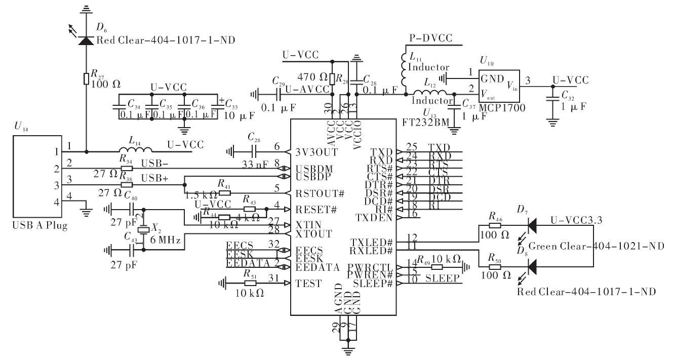 無線傳感器網(wǎng)絡(luò)由大量節(jié)點(diǎn)組成,這些節(jié)點(diǎn)按一定協(xié)議將采集的數(shù)據(jù)進(jìn)行融合、傳輸,最終將數(shù)據(jù)傳送到個(gè)人電腦上進(jìn)行處理和觀察,同時(shí)節(jié)點(diǎn)工作需要將特定的程序?qū)懭隖lash中。目前個(gè)人電腦最常用的接口為USB,而微處理器使用USART接口,為實(shí)現(xiàn)兩種接口之間轉(zhuǎn)換,節(jié)點(diǎn)使用FT232BM芯片作為轉(zhuǎn)換芯片。FT232BM是一種單片USB到異步串口轉(zhuǎn)換芯片,支持全握手和調(diào)制解調(diào)接口信號(hào),在TTL級(jí)數(shù)據(jù)傳輸速度范圍為300 bit·s-1~3 Mbit·s-1.芯片通過USB總線供電,工作電壓為4.35~5.25 V,采用外部6 MHz時(shí)鐘。USB PID、序列號(hào)和產(chǎn)品信息可以保存在外部EEPROM中。USB通信模塊接口如圖5所示。