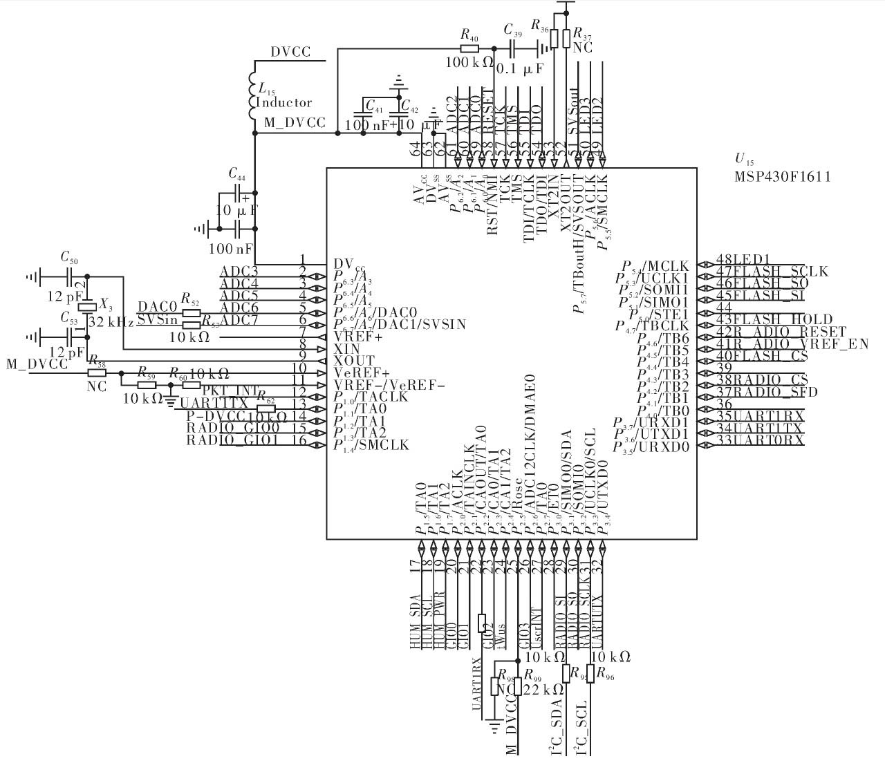 微處理器是無線傳感器節(jié)點(diǎn)的核心,傳感器數(shù)據(jù)的數(shù)據(jù)處理,串行口以及無線模塊的傳輸與控制均需要微處理器的參與。節(jié)點(diǎn)微處理器TI公司的16為超低功耗MSP430F1611.該微處理器工作電壓為1.8~3.6 V,在RAM數(shù)據(jù)保持方式下耗電僅為0.2μA,在激活工作1 MHz的情況下為330μA,可以工作在5中低功耗模式,喚醒時(shí)間<6μm.Flash大小為48 kB,RAM大小為10 kB.芯片內(nèi)部有16位定時(shí)器Timer_A和Timer_B具有捕獲/比較功能;大量的捕獲/比較寄存器可用于事件計(jì)數(shù)、時(shí)序發(fā)生等;多功能串口(USART)可以實(shí)現(xiàn)異步、同步和I2C串行通信,可以方便地實(shí)現(xiàn)多級(jí)通信的應(yīng)用;具有較多的I/O端口,最多達(dá)6×8條I/O口線,P1、P2口還可以接收外部上升或下降沿的中斷輸入;12位A/D轉(zhuǎn)換器有較高的轉(zhuǎn)換速率,最高可達(dá)200 kbit·s-1,能滿足大多數(shù)數(shù)據(jù)采集的應(yīng)用。微處理器模塊如圖6所示。溫度濕度傳感器連接P1口5、6、7管腳,無線模塊SPI接在P3口1、2、3和P4.4管腳,USB通信模塊數(shù)據(jù)線連接到P3口6、7管腳。其他管腳分別用于控制和擴(kuò)展接口。外部晶振大小為32MHz。