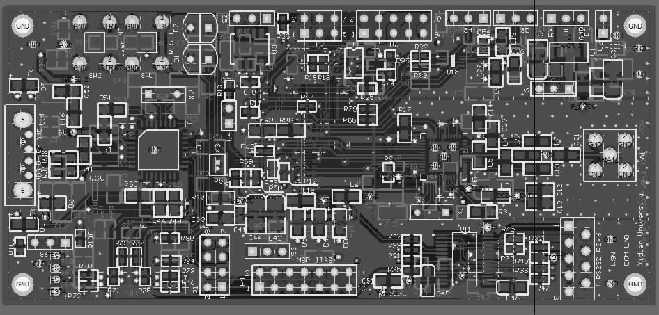 電路板根據(jù)不同的標(biāo)準(zhǔn)有不同的分類,在設(shè)計(jì)中大多數(shù)根據(jù)板的數(shù)目分類,在電氣連接關(guān)系復(fù)雜的電路板設(shè)計(jì)中,雙面板難以滿足電路布線的要求,這時(shí)就必須考慮使用多層板。本節(jié)點(diǎn)采用4層板,頂層主要是USB模塊和無線模塊,底層為微處理器模塊,內(nèi)部層為電源層和地層。設(shè)計(jì)結(jié)果如圖7所示。
