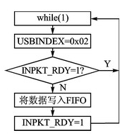 下面以IN端點(diǎn)2為例,說明數(shù)據(jù)如何通過USB接口傳遞到電腦上。當(dāng)電腦發(fā)出IN請求時(shí),如果USB端點(diǎn)2的FIFO非空,就向電腦發(fā)送FIFO里的內(nèi)容;如果FIFO為空,則向電腦發(fā)送一個(gè)空包作為回應(yīng)。CC2531通過寄存器位USBCSIL.INPKT_RDY來控制電腦和8051 MCU內(nèi)核對USB的FIFO的使用權(quán)。當(dāng)INPKT_RDY=1時(shí),電腦正在對USB端口進(jìn)行訪問,8051 MCU內(nèi)核無法向FIFO內(nèi)寫入數(shù)據(jù);當(dāng)INPKT_RDY=0時(shí),8051 MCU內(nèi)核可以將發(fā)送數(shù)據(jù)寫入FIFO內(nèi),置位INPKT_RDY=1,完成數(shù)據(jù)的上傳。其流程如圖4所示。
