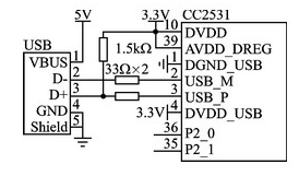 CC2531的USB硬件連接很簡單,如圖3所示。采用USB總線供電方式,通過電壓轉(zhuǎn)換芯片AM11173.3為硬件電路提供3.3 V電壓(圖中未畫出)。由于該設(shè)備為全速設(shè)備,因此D+信號線通過電阻上拉。